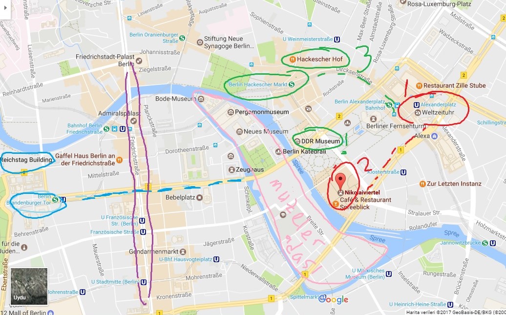 Google maps üzerinde Mitte’de görebileceğiniz yerleri kendim işaretledim, büyütüp inceleyebilirsiniz