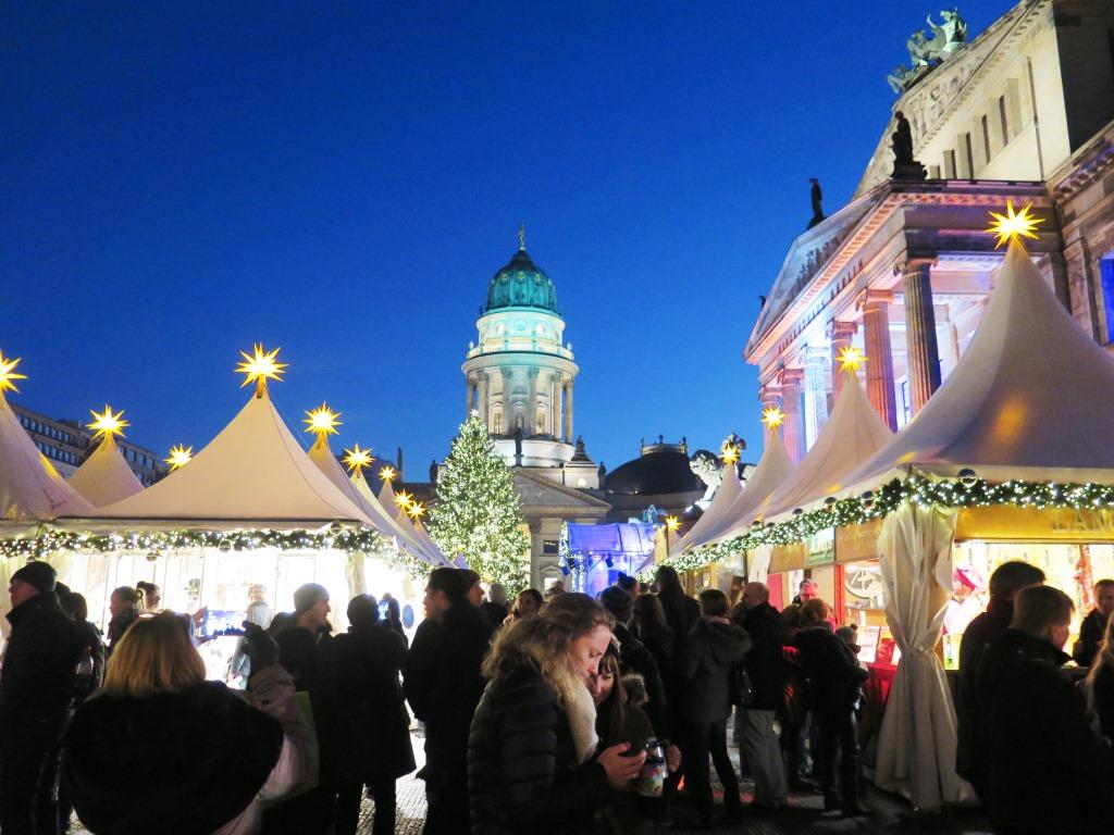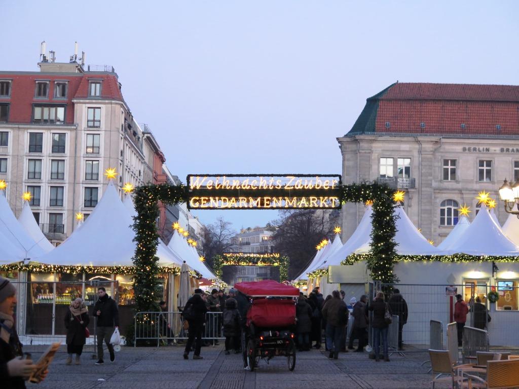 Berlin’in birçok yerinde Noel pazarı kuruluyor ama en güzelinin Gendarmenmarkt‘daki olduğu söyleniyor. Diğer pazarların aksine buradaki standlar ahşap değil, beyaz çadırlar şeklinde. Bazı pazarlara giriş ücreti istenebiliyor, 1-2 euro gibi. Gendarmenmarkt Noel pazarı’na da 1 euro karşılığında girmiştik.