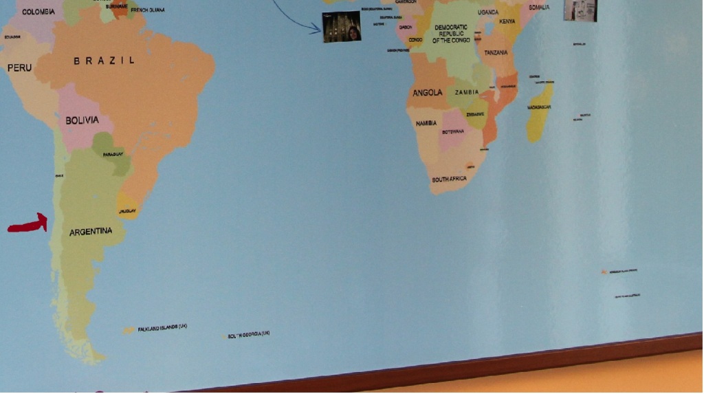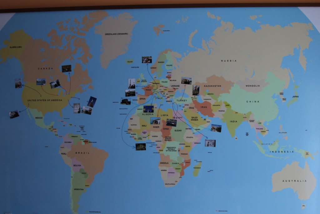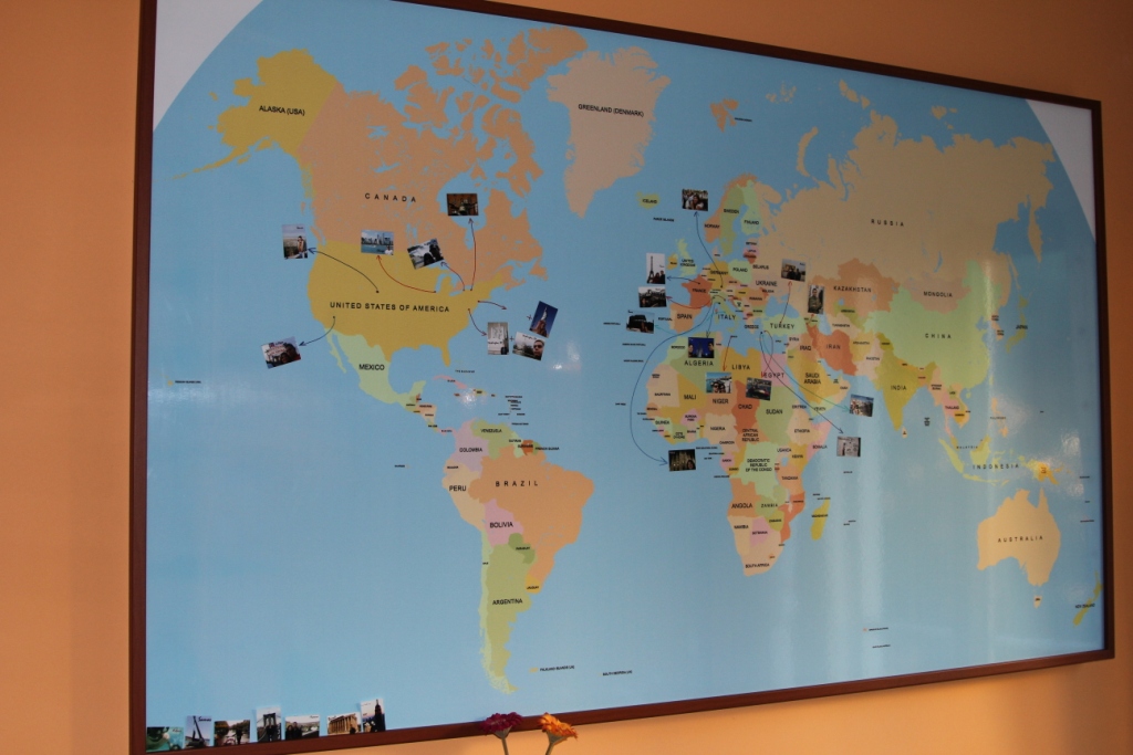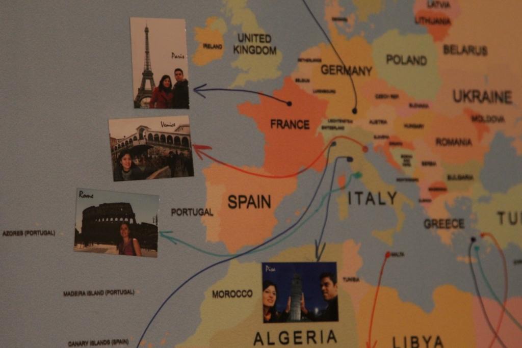 İnternetten bulduğumuz bir dünya haritasını tabelacıda ahşap bir malzemeye bastırdık. Beyaz tahtalara yazdığımız kalemler ile (biz okulda marker derdik, Türkçesi nedir bilemedim) oklar çıkartıp küçültülmüş boyutta bastırdığımız fotoğrafları çift taraflı bant ile yapıştırdık. Sonuç aşağıda gördüğünüz gibi.