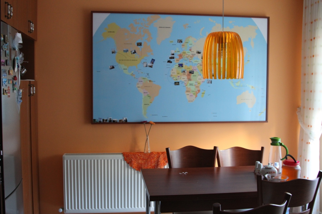 "Öyle mi yapsak, böyle mi yapsak, kağıt haritaya raptiye ile mi işaret koysak, sacdan yapıp mıknatıs mı kullansak, evin neresine assak" derken zeki ve becerikli kocam olaya el koydu ve aşağıdaki harita mutfağımızdaki yerini aldı.