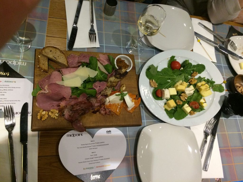 İlk önce Antipasti tabağı, peynirler ve bruschetta ile Narince üzümünden yapılan beyaz şarap ikram edildi. Narince Tokat yöresine ait adı gibi "narin" bir üzümmüş.
