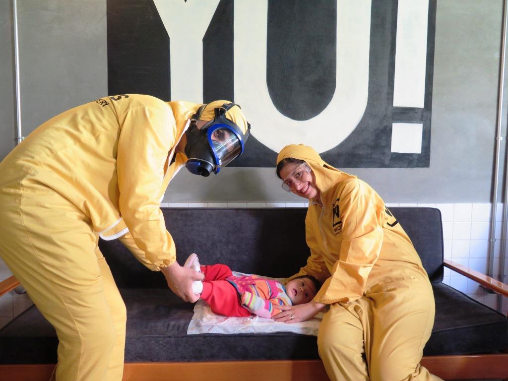 Diğer bir güzellik de Breaking Bad dizisindeki Walter White ve Jessie Pinkman'ın uyuşturucu üretirken giydiği kıyafetleri giyip poz verebiliyorsunuz. Biz de Olgun'la yanımızdaki el kadar bebeğe bakmadan bu kostümlerden giyip poz vermeye karar verdik. Koskoca anne baba olmuşlar, şu hareketlere bakın…
