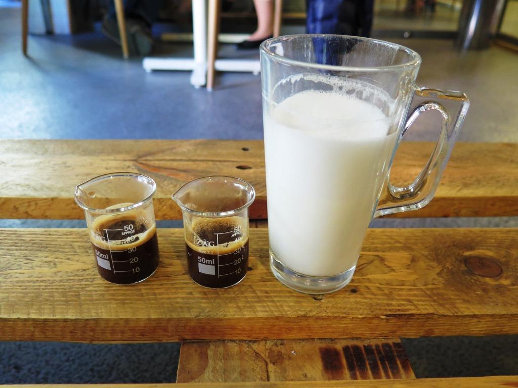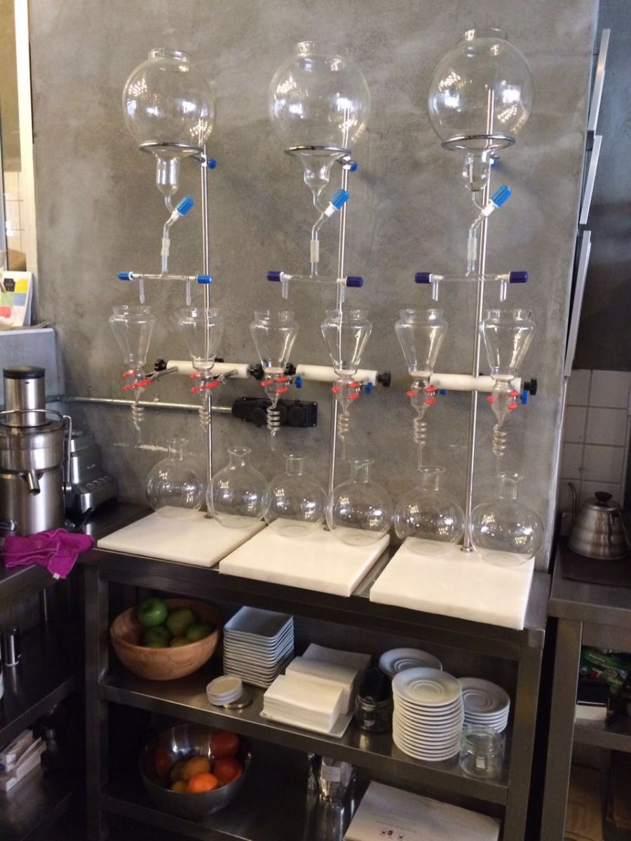 Kafenin atmosferine duvarda periyodik cetvel, kahvelerin demlendiği laboratuar aletleri, kahvelerin sunulduğu beherler, erlenmayerden vazo gibi ayrıntılar hoşluk katıyordu.