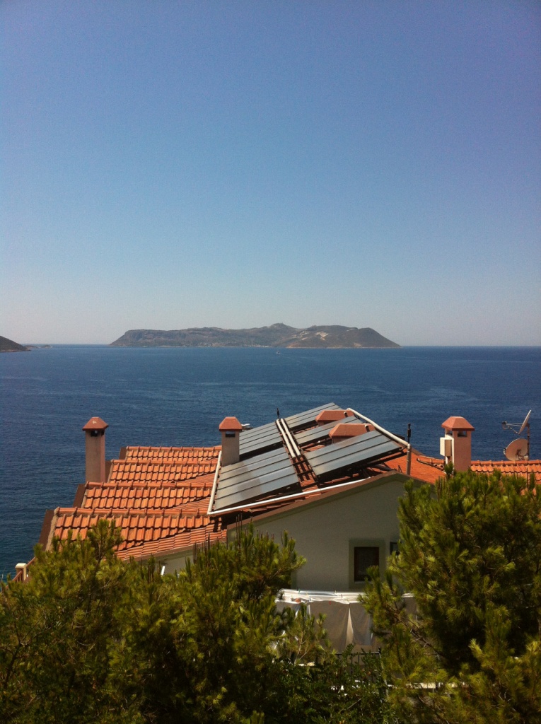 Kaş'tan Meis. Sadece Kaş'a bakan bölümde şehirleşme var.