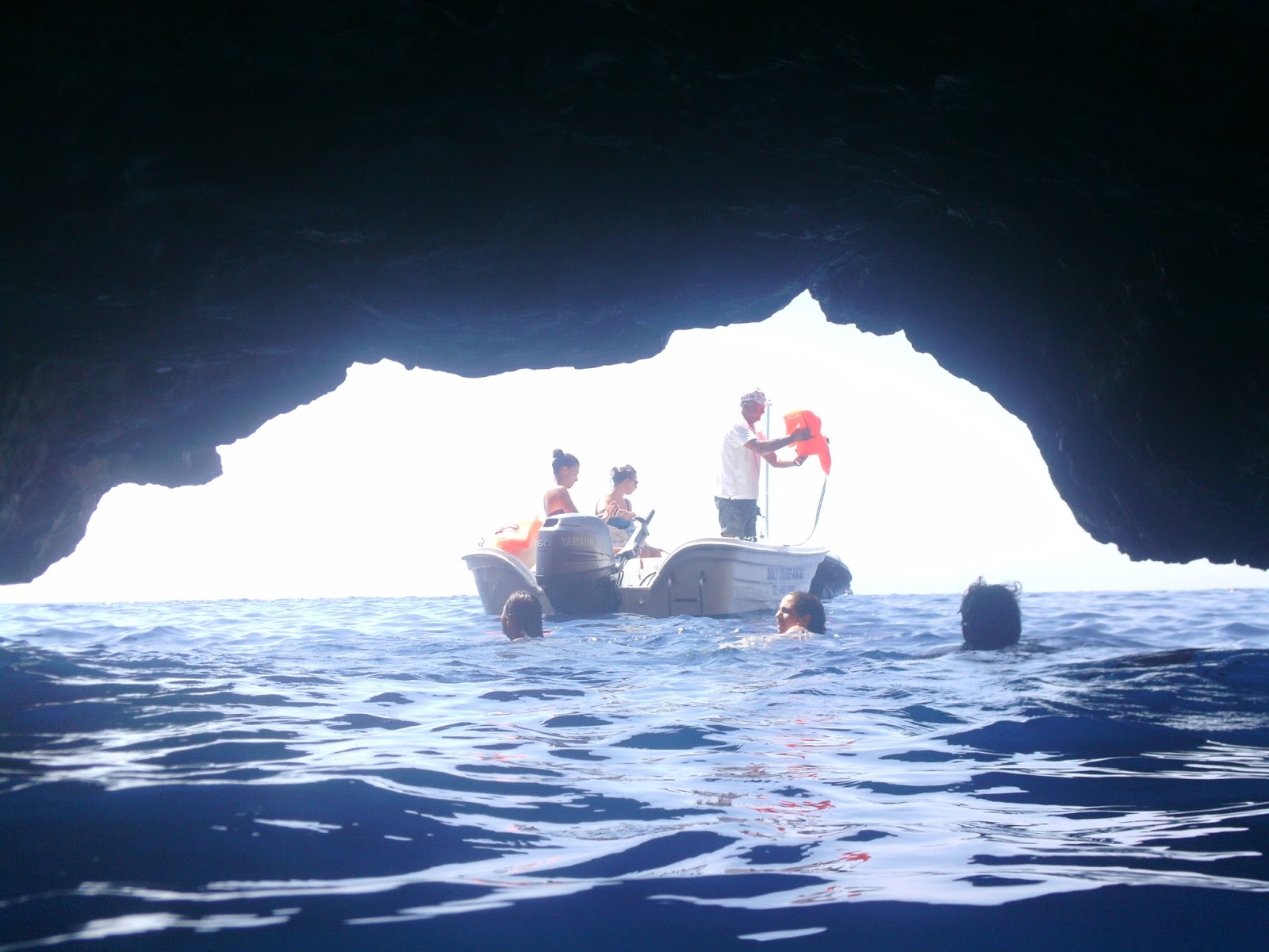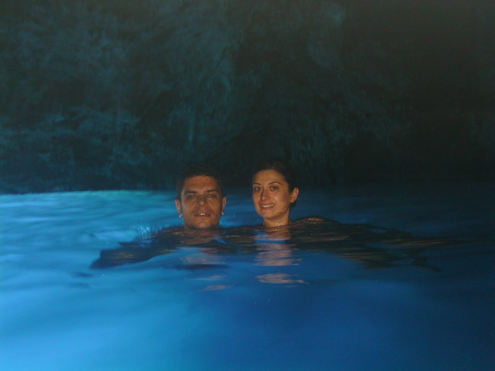Mavi mağarada bizim gittiğimiz gün su yüksek olduğu için tekne mağaranın içine giremedi. Kaptanımız Kostas bizimle beraber 4 kişi daha olan teknede bizi yerlere yatırıp bir kaç deneme yapsa da başarısız oldu. Neyse ki bizim su altı kameramız vardı ve içeriyi fotoğraflayabildik.
