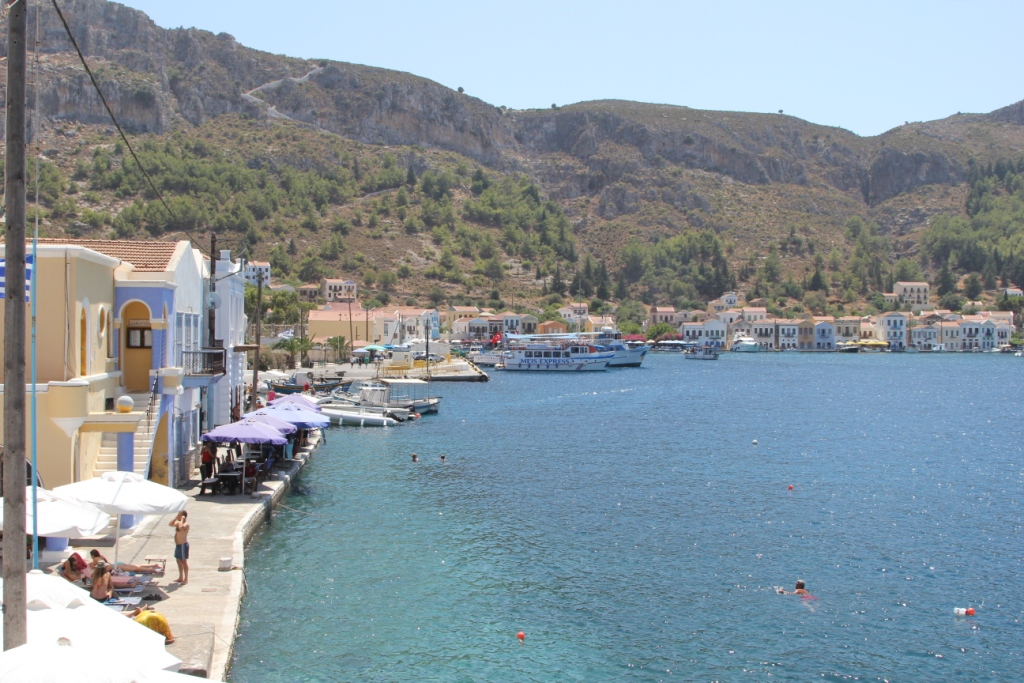 Meis merkezde de dolanıp denize girebilirsiniz. Bazı kafeler kapısının önüne şezlong atmış, insanlar oralardan denize giriyordu.