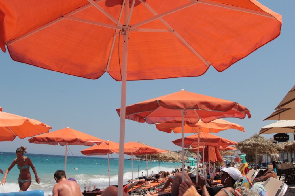 Plajlarda şezlog şemsiye kiralanıyor. Bazen plajdaki Taverna veya kafede bir şey yiyip içerseniz şezlongdan para almıyorlar. Alsalar bile plaj giriş parası yok, şezlonglar da 2 kişilik 5-6 Euro.
