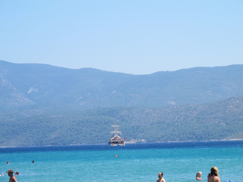 Öncelikle ülkemize en yakın nokta olduğu için Psili Ammos adlı plaja gitmek istedim. Memleketimden kopamıyorum, ne yapabilirim? Her zaman denize girdiğimiz Dilek Yarım Adası Milli Parkı ile karşılıklıydık. Hatta Güzelçamlı'dan kalkan tekne turlarından birini gördük ufukta. Sisam tarafı meğer bizden daha şanslıymış, burada deniz muhteşemdi! Eminim Türkiye'de çok dalga vardı, çünkü rüzgar Sisam'dan karşıya doğru esiyordu.