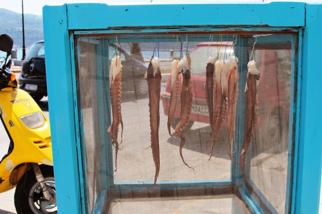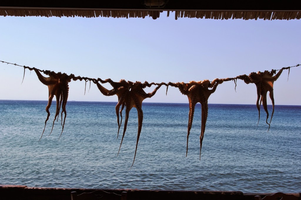 Ahtapot ızgara ahtapodun en leziz hali olarak biliniyor. Izgaraya girmeden önce ahtapotlar güneşte 1-2 gün kurutuluyor. Kurutulmak üzere sergilenen ahtapotlar güzel manzaralar oluşturuyor, turistler illa bir fotoğraf çekiyor…